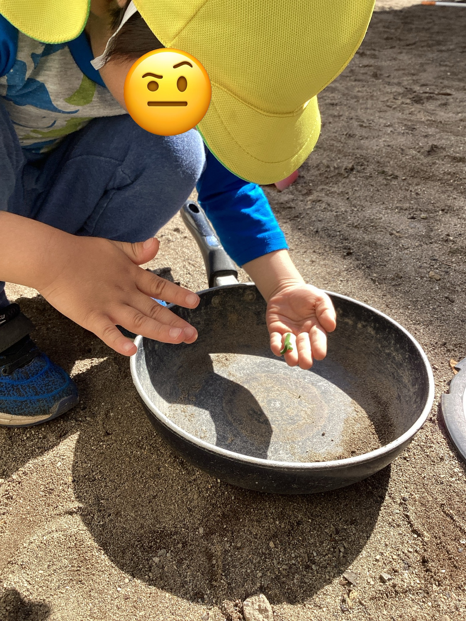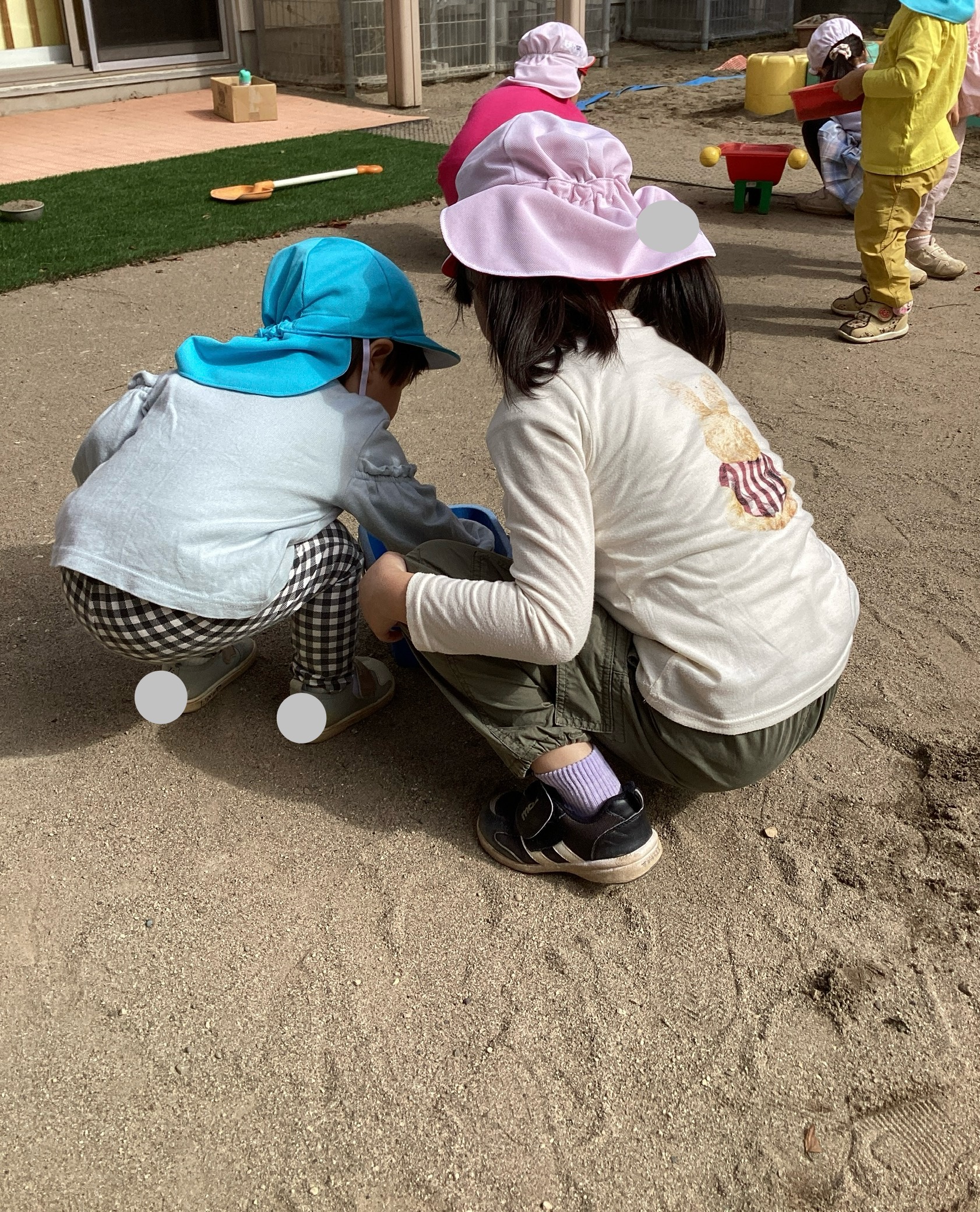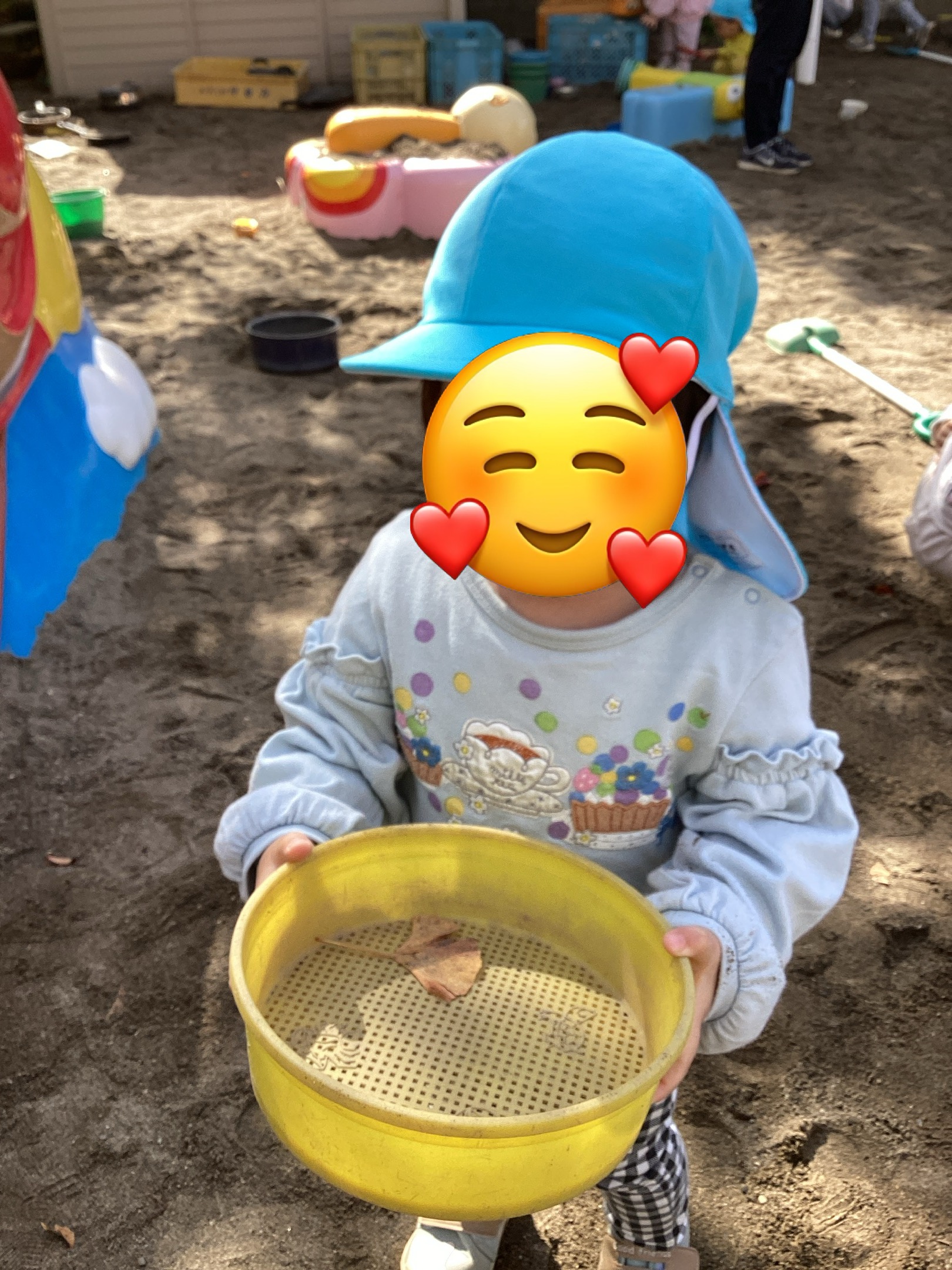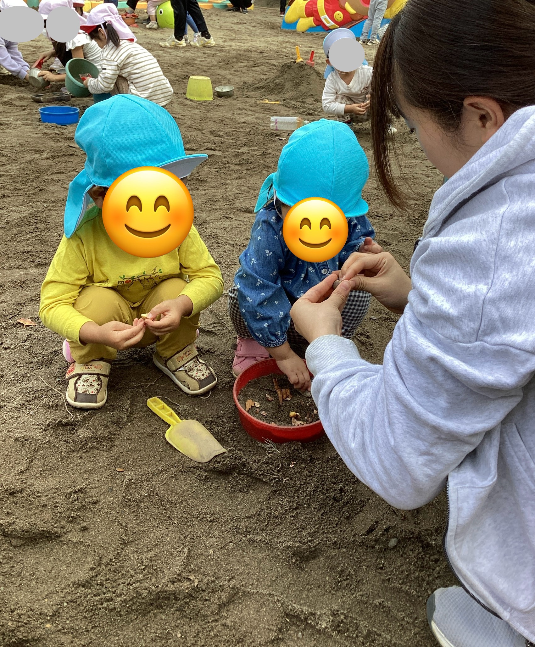 子ども達は、園庭で木の実を使った砂遊びをしたり、お友だちを誘っての鬼ごっこや虫探しを楽しんでいました(*^_^*)