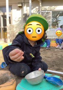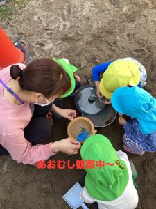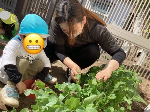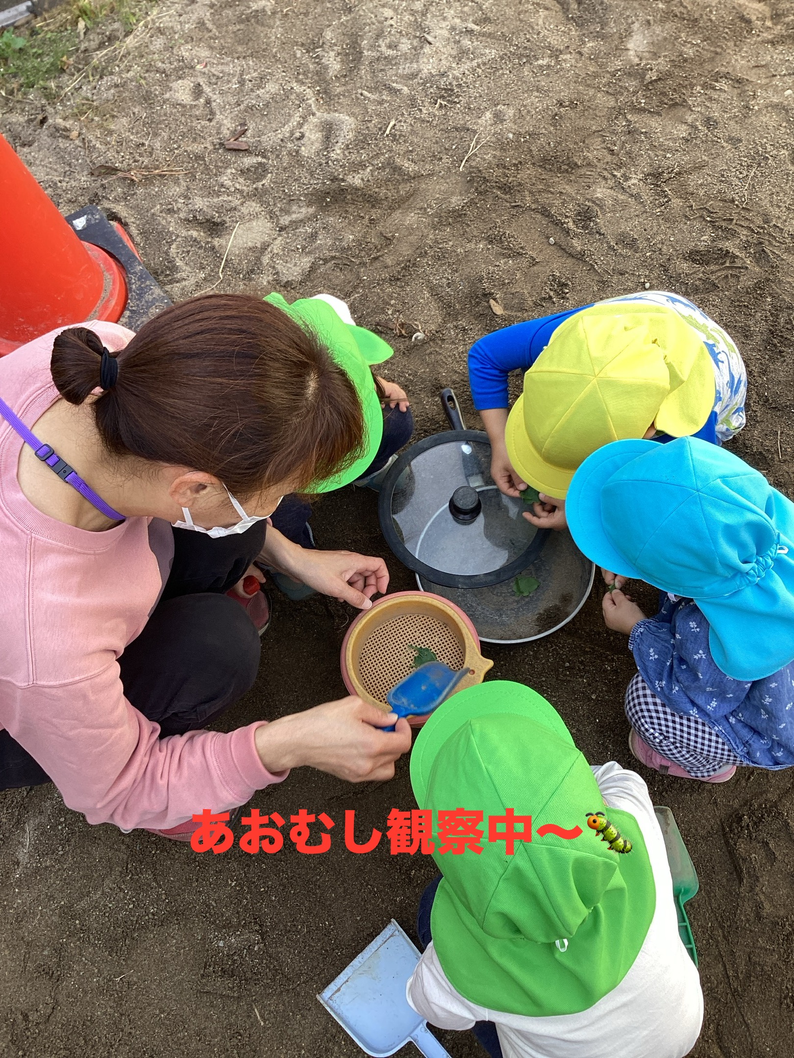 また、年長さんの育てている大根の葉っぱに「あおむし」を見つけると、そ~っとつまんで「あおむしゲット!」と大喜びしながら楽しんでいます!