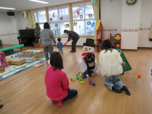 みんなでスノーマンのボタンにボールを入れたり、ツリーのオーナメントの穴にボールを入れたりして楽しみました!