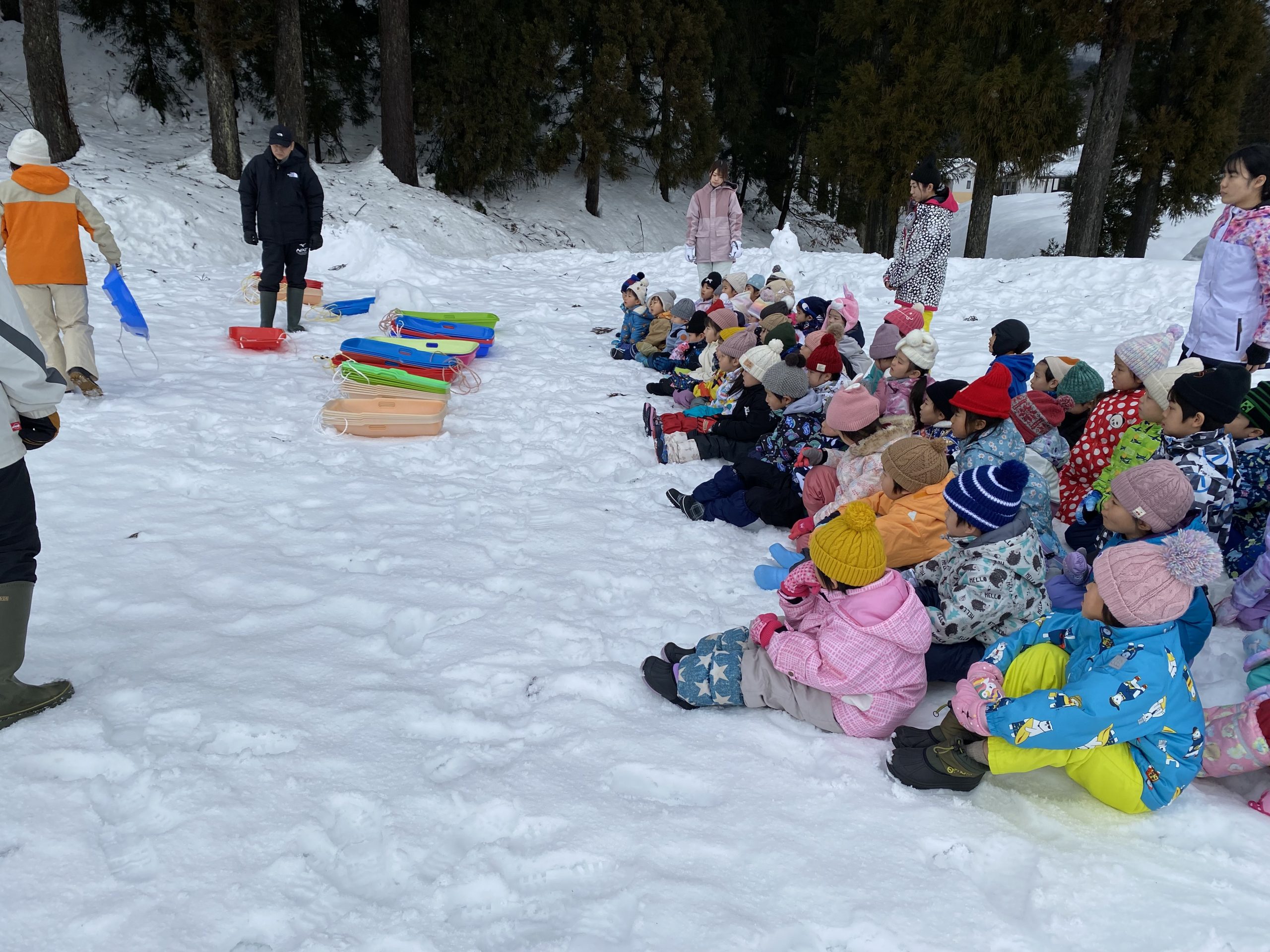 スキー場に到着後は、そりが初めてという子もいるので、そりの滑り方やブレーキのかけ方を確認。そして待ちに待ったそり遊びスタート!一人一つそりを手に持ち、坂道を上り、順番にそり遊びを楽しみました。最初のうちは雪がふかふかしており、やや滑りが悪かったものの、何度か滑るうちに徐々に雪の状態が良くなり、少しずつスピードが出てきました。