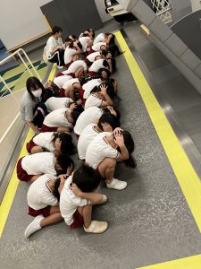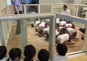地震の体験では、震度4の地震が起きた時、どのように身を守ると良いかを考え、すぐにダンゴムシのポーズで頭を守っていましたよ。外で地震が起きた時は、下に何が落ちているか分からないので、しゃがんで頭を守りました。