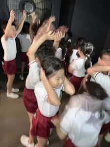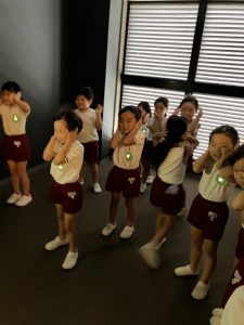 台風の体験では、強い風に立ち向かう子、後ろの方で強風を感じる子とさまざまでしたが、最後まで台風の体験を頑張りました!