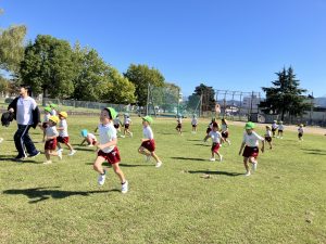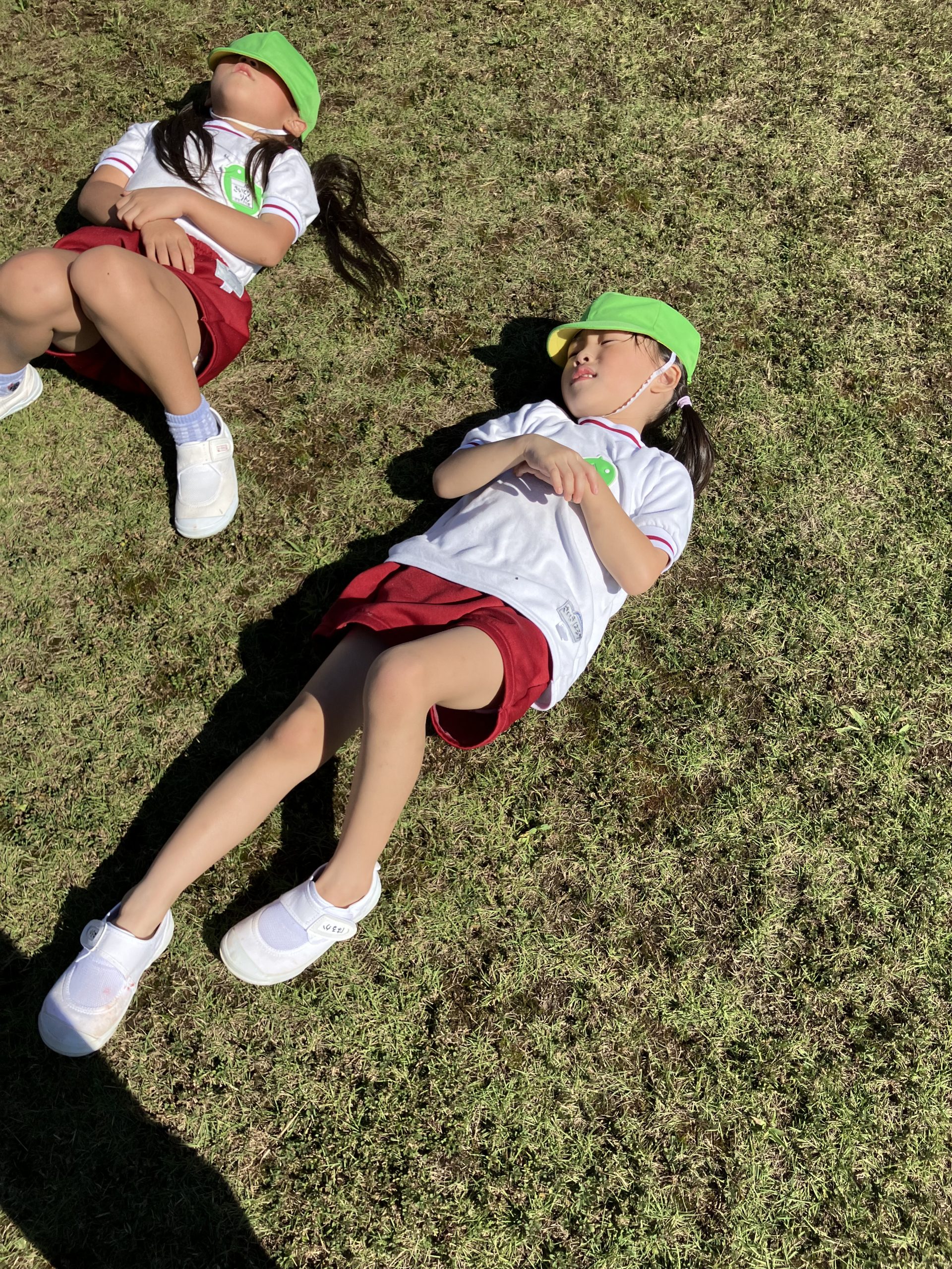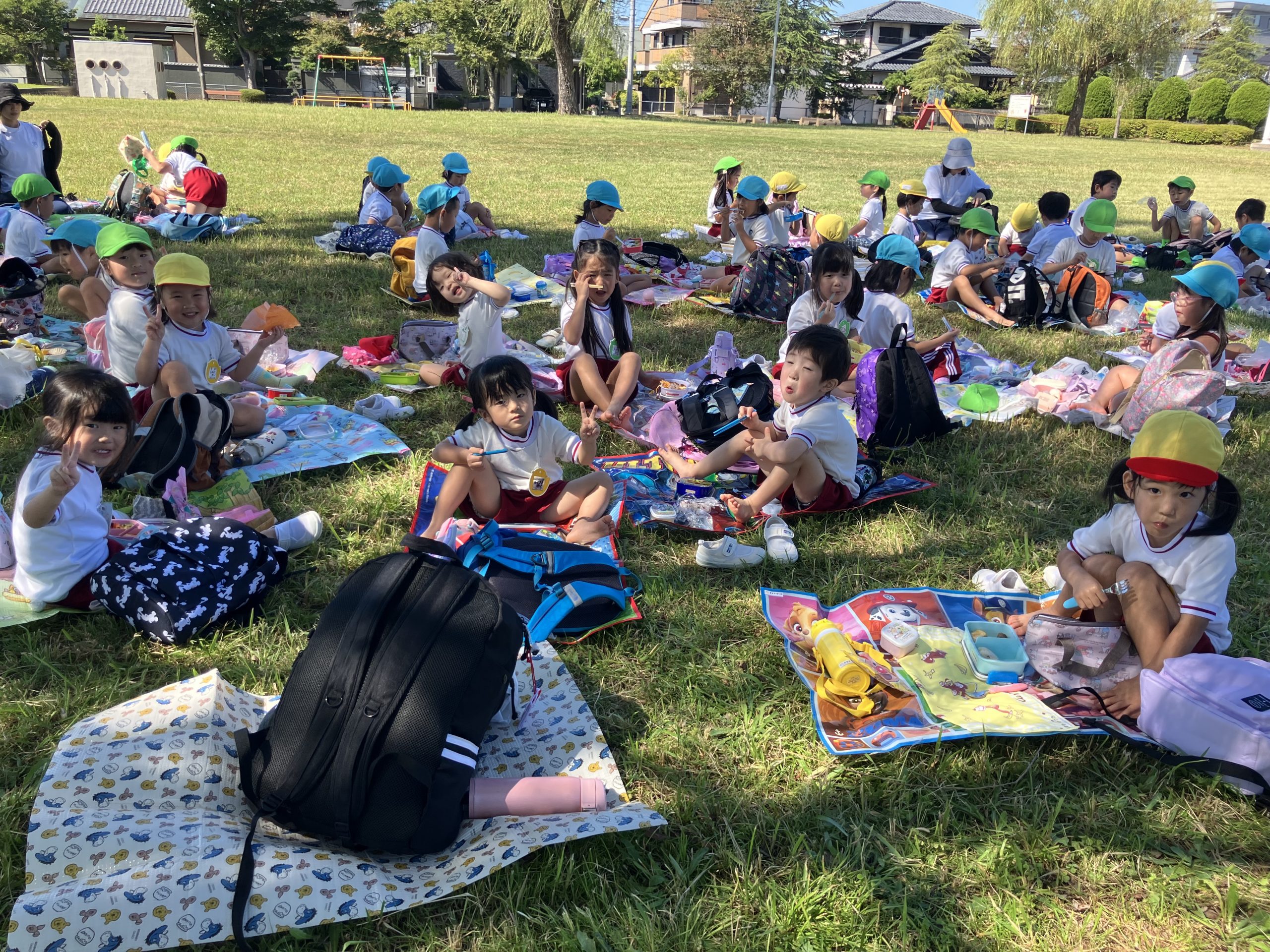 身体を動かすことで程よい疲れと共に空腹感を味わうと、「早くお弁当たべた~い!」「もうお腹ペコペコ~」とお弁当を早く食べようというリクエストの嵐。リュックサックから出した敷物を敷き、友達との会話を弾ませながらお家の人の愛情いっぱいのお弁当を食べました。外でお弁当を食べる楽しさを味わえたのではないかと思います。