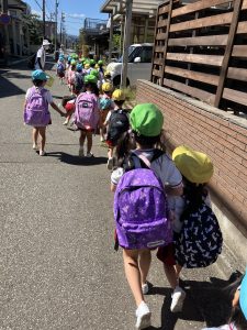 帰りも、大きいクラスの子がしっかりと優しく手をつなぎ、交通ルールを守りながら無事に園まで帰ることができました。