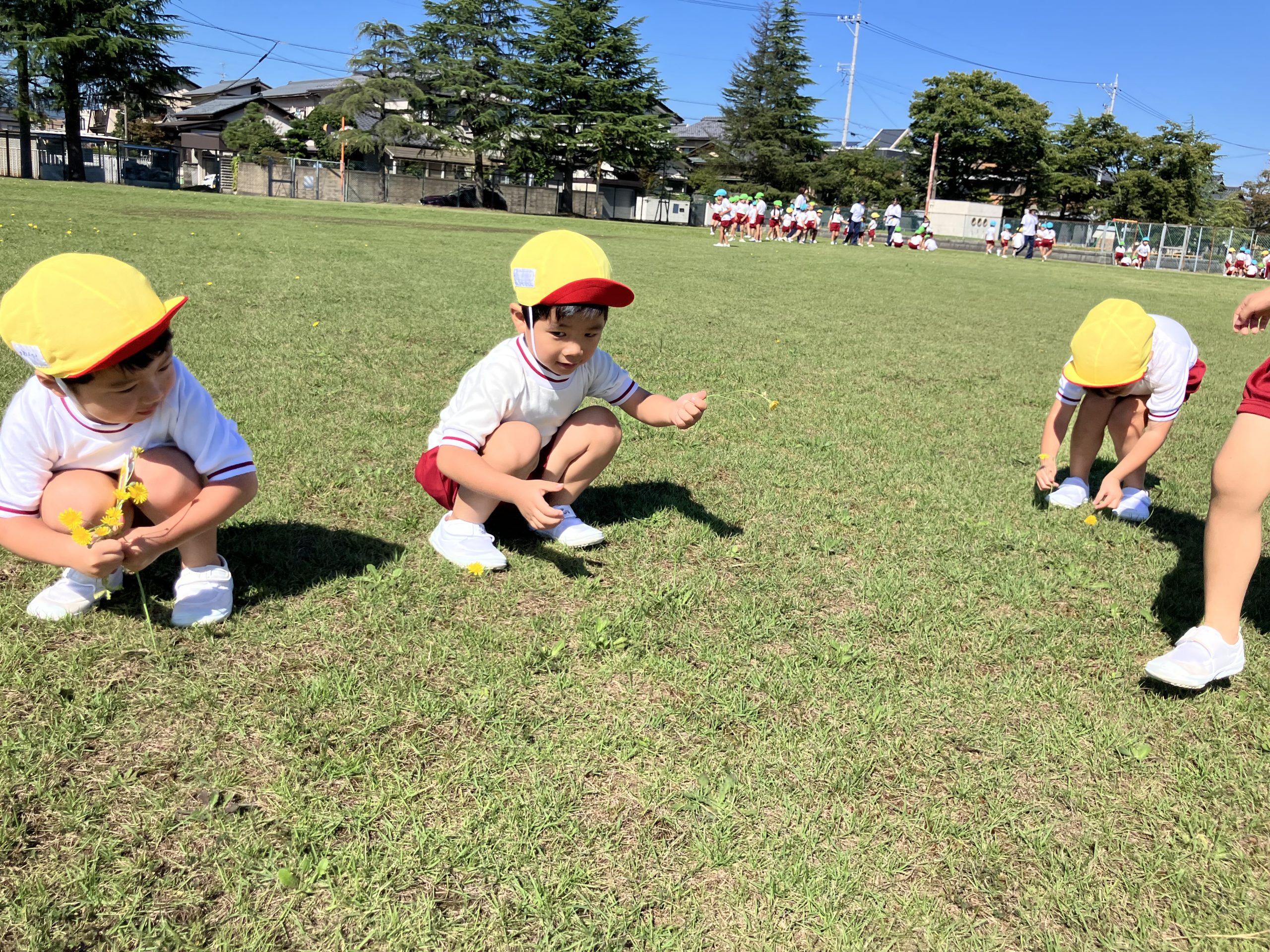 行き先は和田公園。遊具は少なめですが、広々とした空間があり、そこでのびのびとかけっこをしたり、草花を見つけて遊びに取り入れたり、トンボを捕まえようとしたり・・・。それぞれが好きな遊びを見つけて思い切り楽しみました。普段は園にある様々な玩具で遊ぶことが多いですが、ボールやフラフープなどがなくても身体一つで元気いっぱい、笑顔いっぱいで遊ぶ子ども達でした。