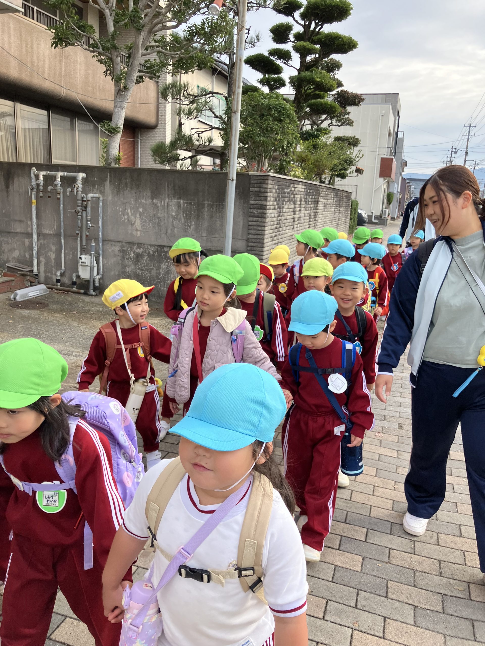 普段のお散歩に比べ少し距離もありますが、『パプリカ』や『かあさんのおつかい』を歌いながら楽しそうに歩く子ども達。去年は大きいクラスの子に手をひかれていた子も今年は自分がお兄さん、お姉さんとして小さい子の手を優しくひいて連れて行ってくれる頼もしい姿もたくさん見られましたよ。