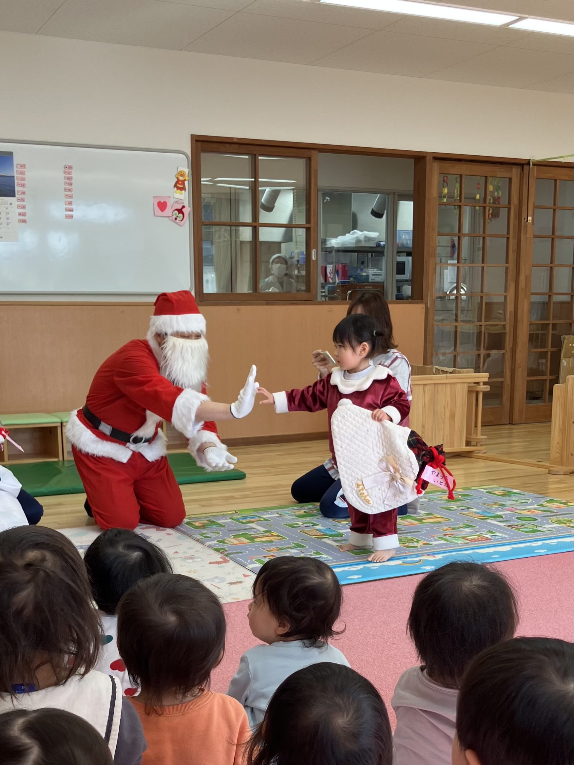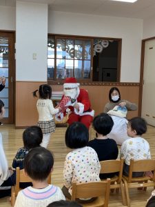 ひよこ0・1・2組のお友達は、サンタさんの登場に少しドキドキする子もいましたが、