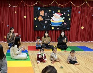 今回はクリスマスにちなんだ歌や楽器遊びをしたり、親子でツリーの製作をしたり、