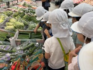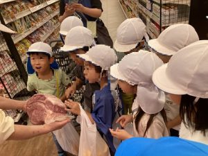 おいしそうな食材がずらりと並んでいます!買い物リストを見ながら、お目当ての食材を探しているうみ組さんです。お肉を間近で見せてもらうと、その大きさにびっくり!