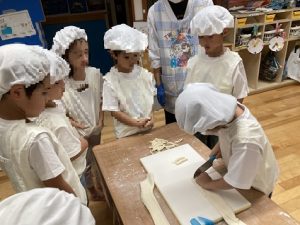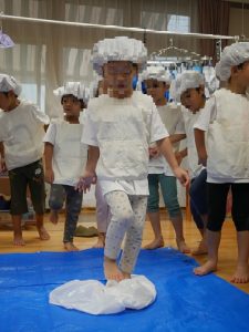 続いてはうどん作り。材料を混ぜて出来た生地を、袋に入れてこねていきます。1、2!1、2!力がいる工程ですが、楽しそうに取り組んでいましたよ。