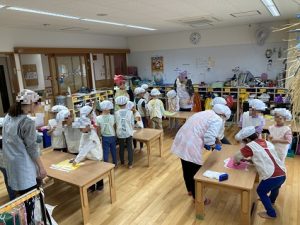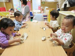 各クラスで、キノコや野菜をちぎる体験をしました。小さいお友だちも上手にちぎることが出来ましたよ♪