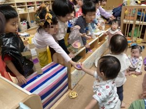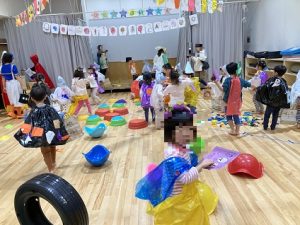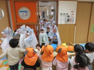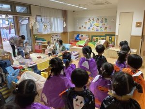 3,4,5歳児クラスは、ホールでハロウィンゲームを開催!3人ずつのグループになり、隠れているマークを探します。「どこにあるかな?ここにあるかも!」と、みんなで協力しながら見つけていました!すべて見つけると、秘密の言葉を教えてもらい、特別なプレゼントがありましたよ☆彡