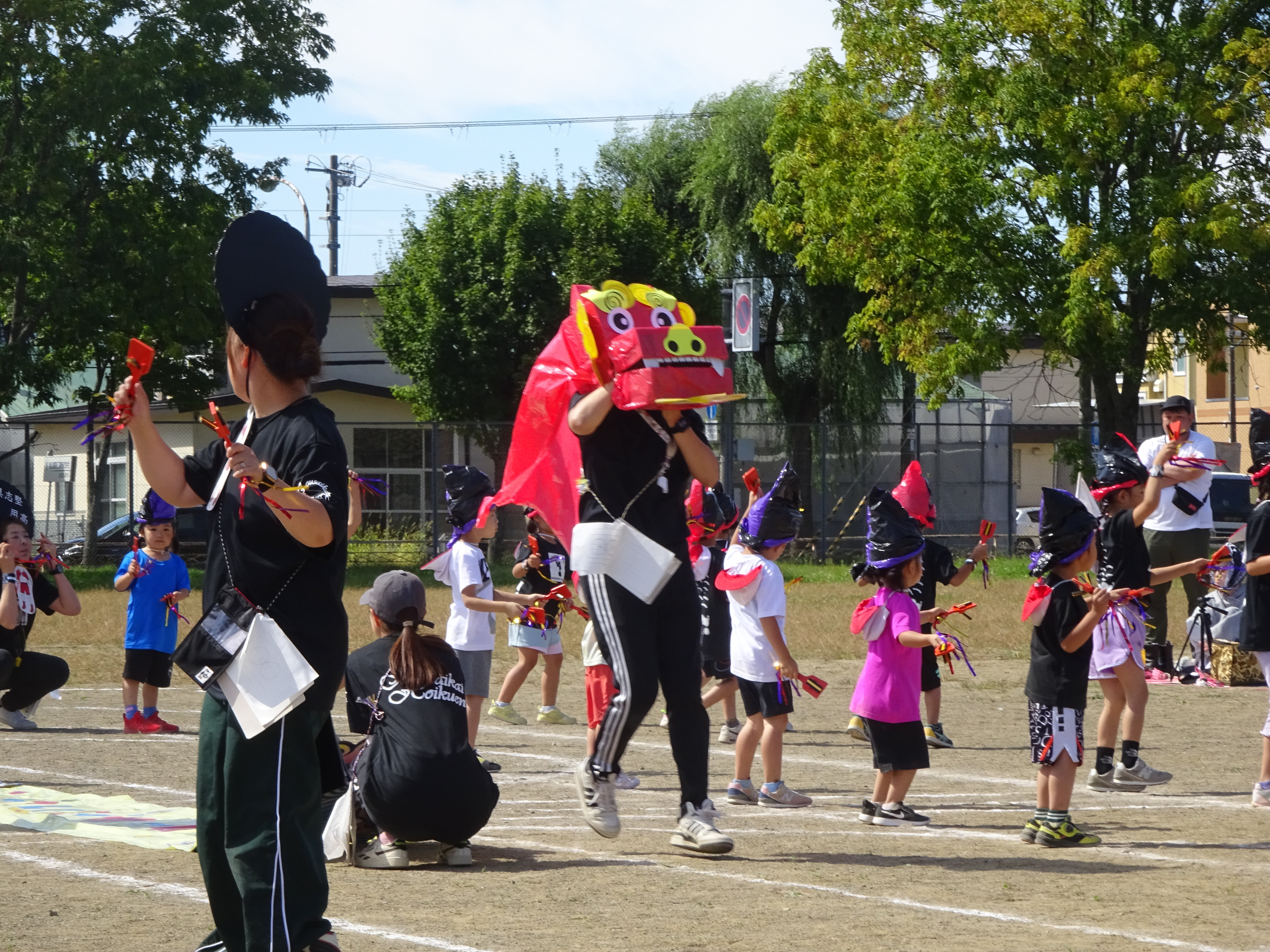 そして、年長さんは憧れの「馬」をつけて演舞します。