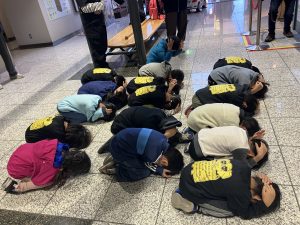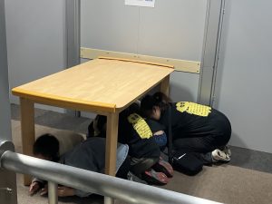 机の下に隠れる「ダンゴムシのポーズ」もみんなで練習しました。