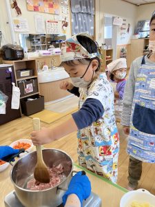 ちょっぴり腰が引けていますが、お肉を炒める任務を頑張りました!