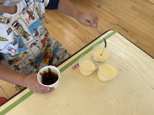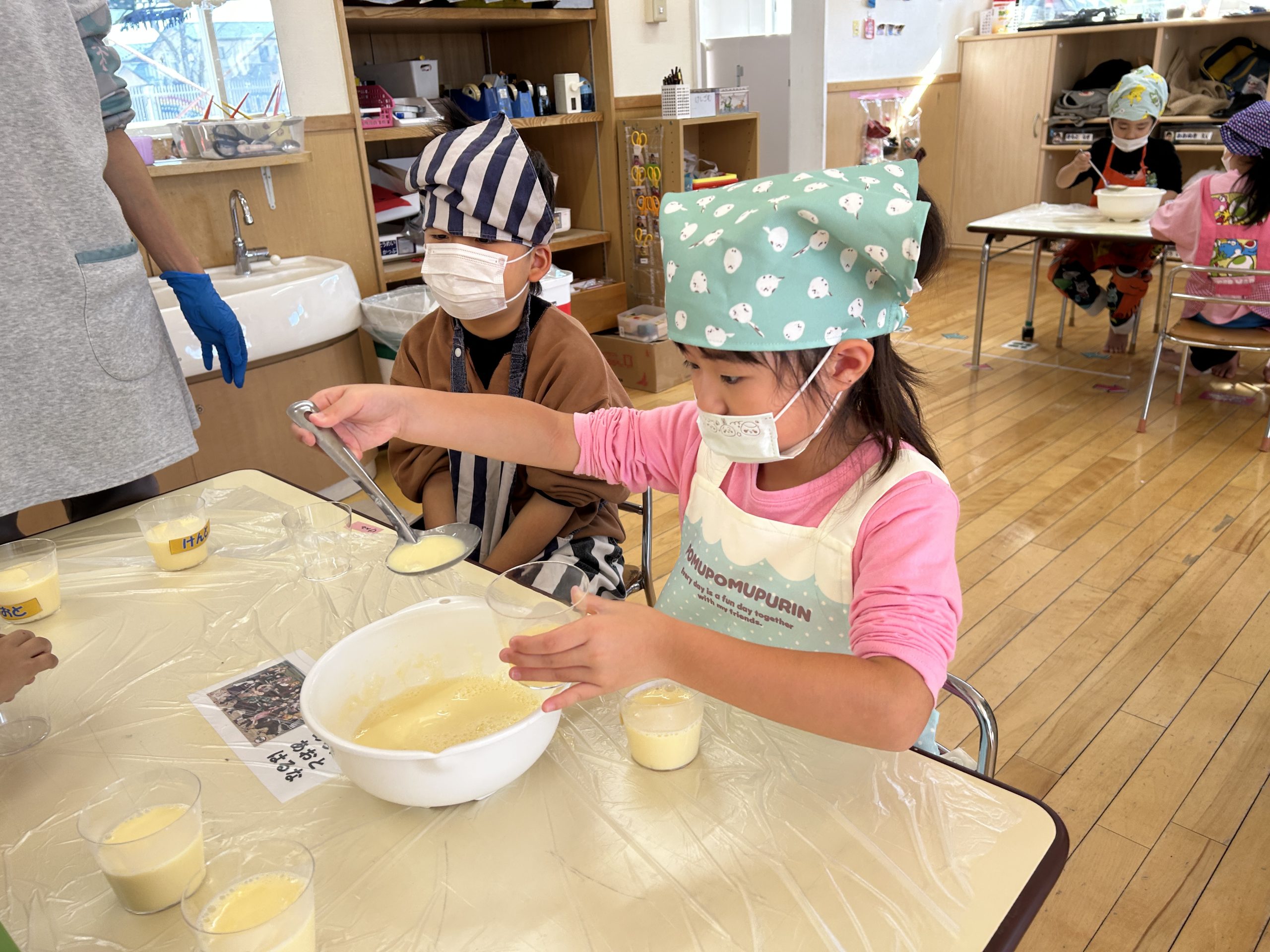今回、作ったプリンはきりん組さんにもおすそ分け(*^_^*) 来年、本格的なクッキングデビューするきりん組さんへサプライズしました(*^_^*)