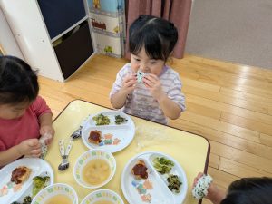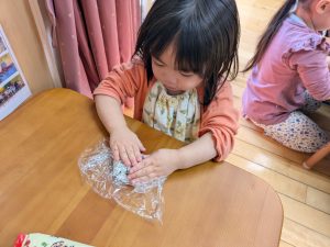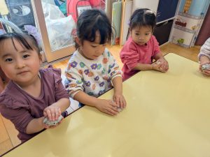 2歳児クラスは、前回おにぎりを作ったので、お家でも挑戦している家庭が多かったです。