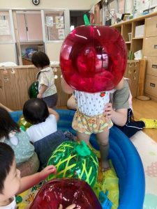 フルーツのビーチボールを使い、投げたり落としたりしていました。