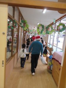 5歳児のお友だちが作ったクリスマスリースをプレゼントしました。
