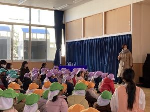 毎月行っている避難訓練。今月は風雪害を想定した訓練でした。停電の為、電気が暖房が消え、園児はコートや靴下を着て遊戯室に集まりました。