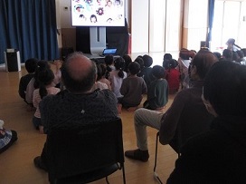 お遊戯室ではスライドショーを見たり、歌をうたったりしました。