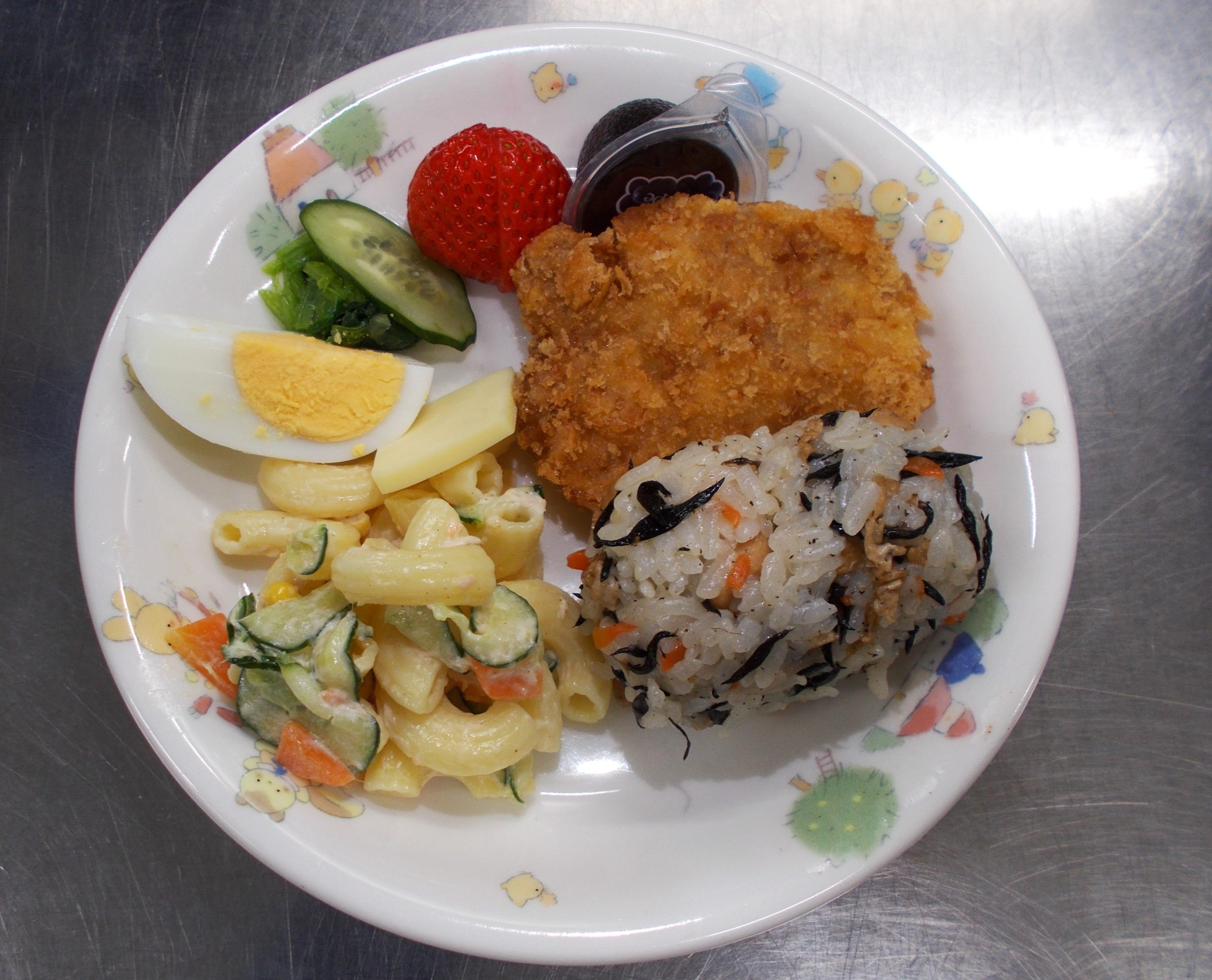 『ひじきご飯、とんかつ、マカロニサラダ、いちご、ゼリー』です。
