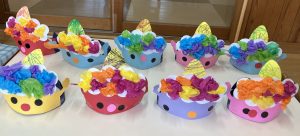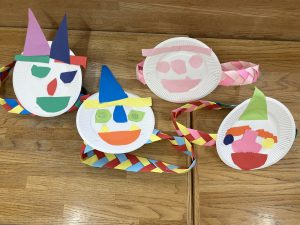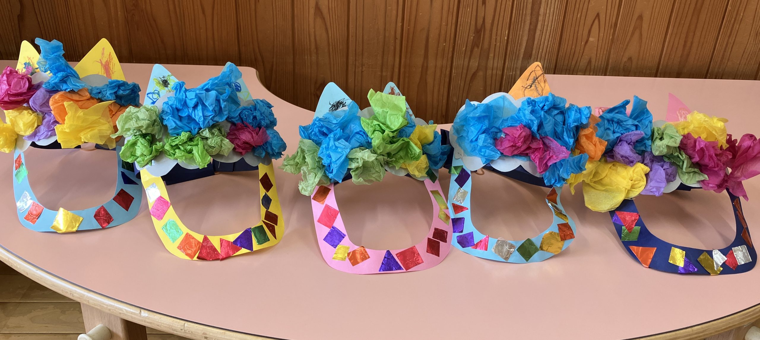 顔はシールで貼りました!髪の毛は自分達でお花紙を丸めて、角も自分達で描きました!