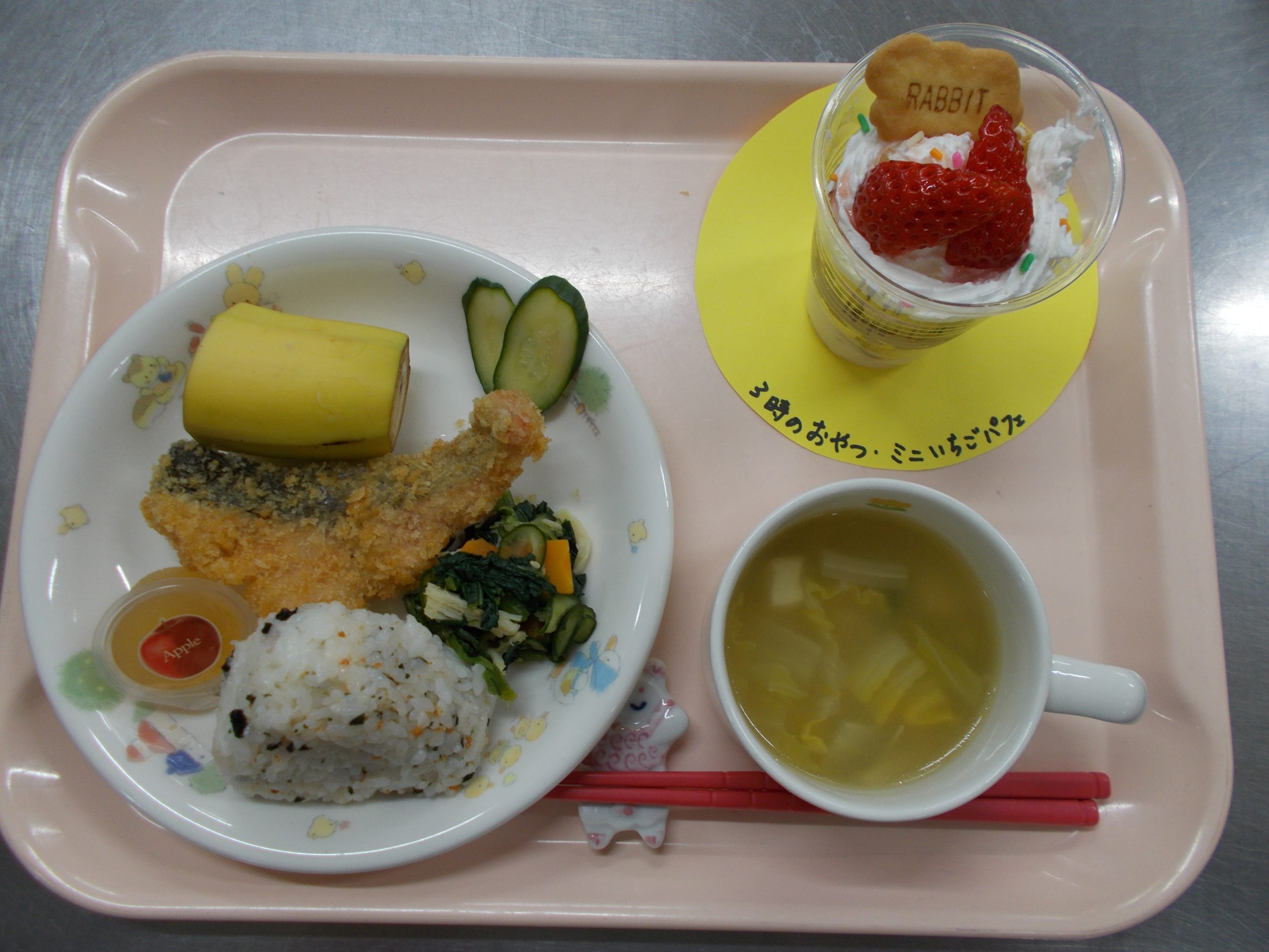 メニューは『おにぎり、フィッシュチーズフライ、カミカミサラダ、白菜の味噌汁、バナナ、ゼリー』です。