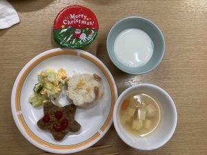 25日(木)のクリスマス会食では、星形のハンバーグに「お星さまだ!」と目を輝かせ、お腹いっぱい食べていました♪