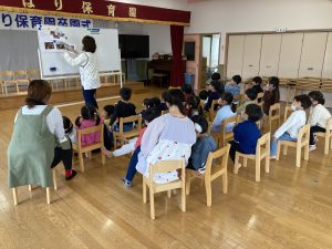 4歳児さんによるインタビューや、赤ちゃんの頃の写真を見てのクイズや、年長さんの思い出クイズ、歌やプレゼントなど盛りだくさんで楽しい時間を過ごしました。