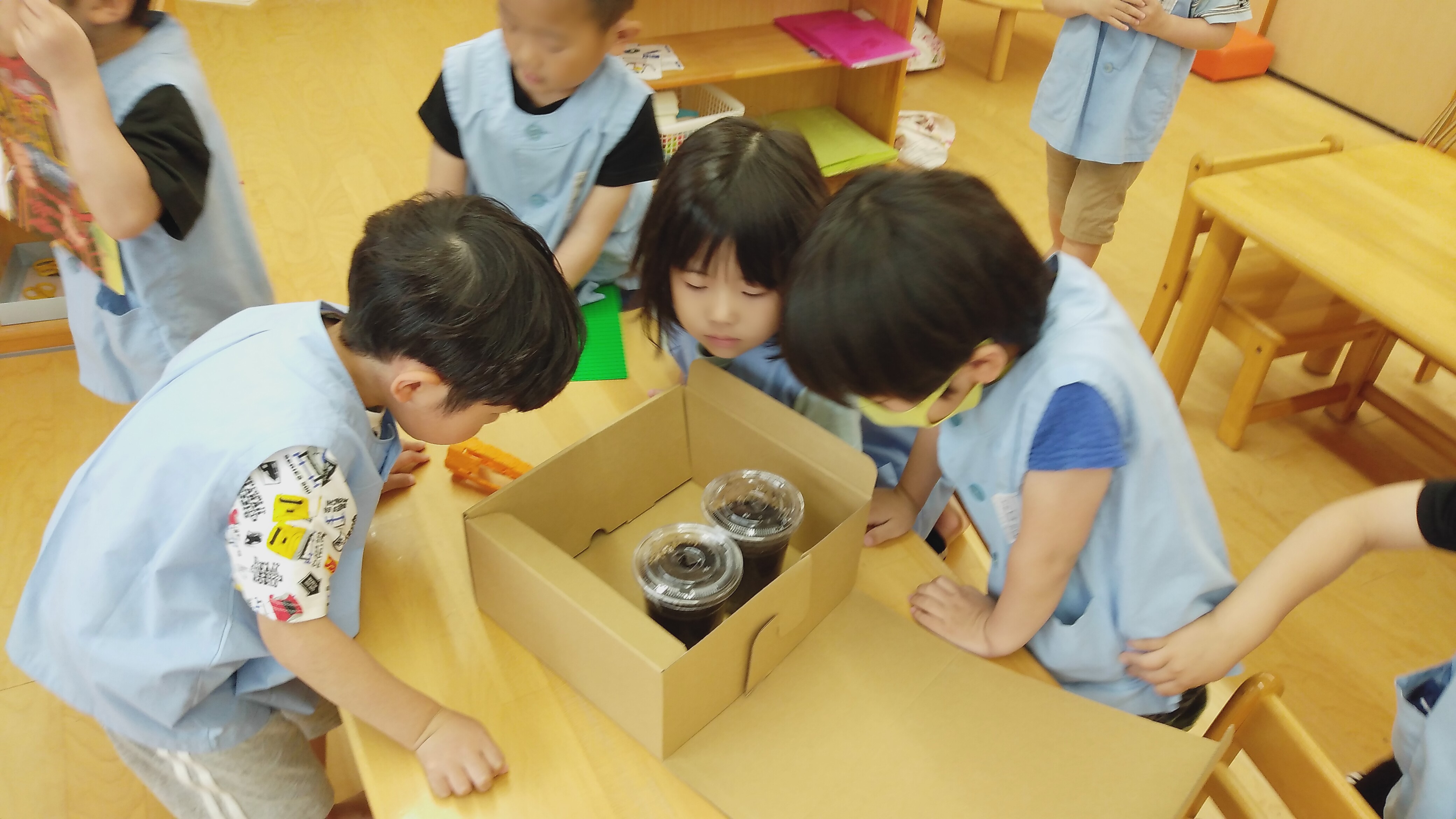 幼虫からさなぎになり、成虫になるのが楽しみで興味津々で見ています。