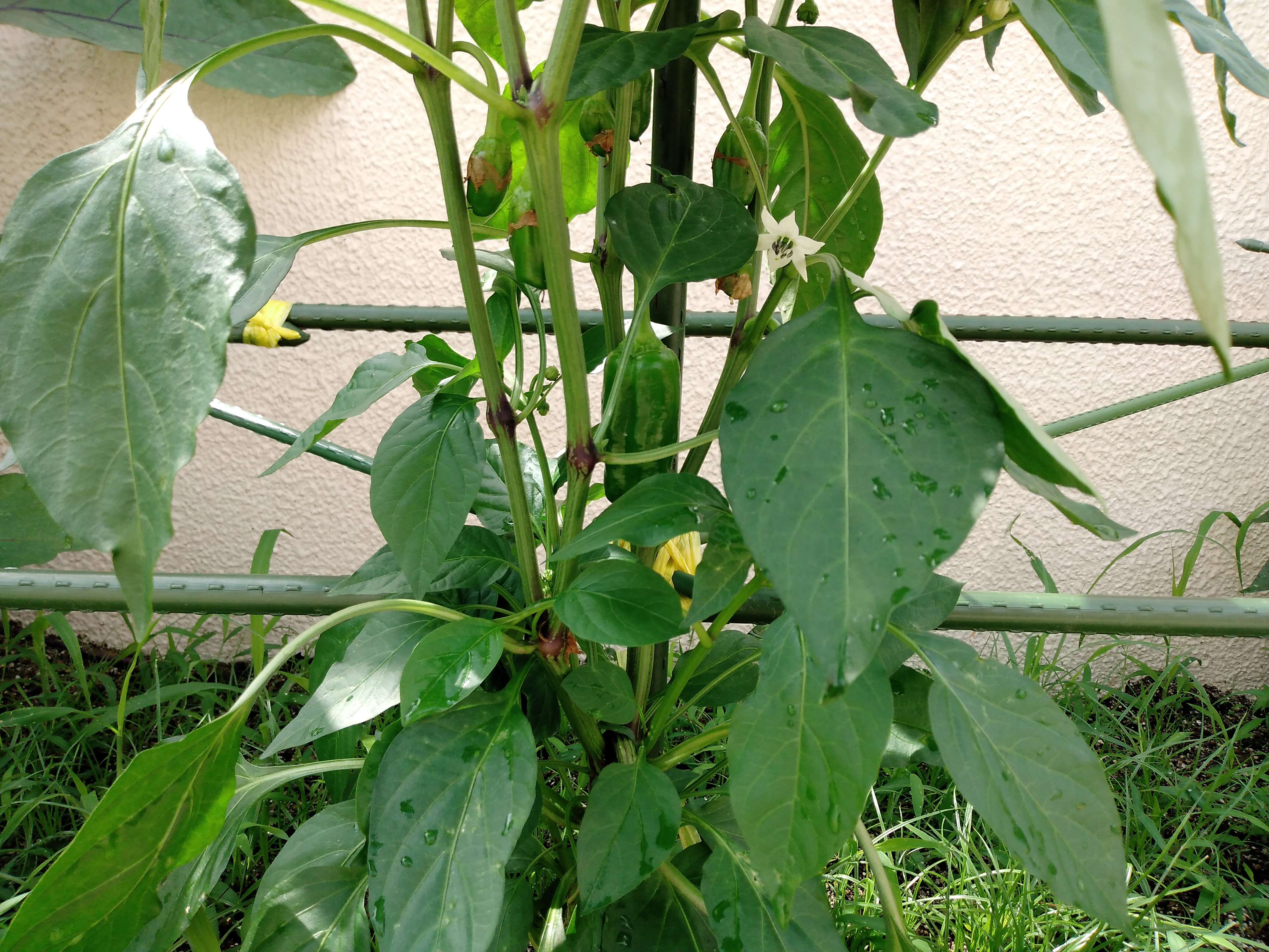 なすび・キュウリに花が咲いています。ピーマンは実がなって収穫が楽しみです。