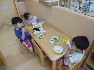 保育園で収穫したきゅうりを使って、お給食の先生が中華きゅうりを作ってくれました。