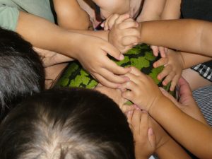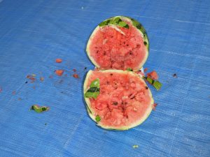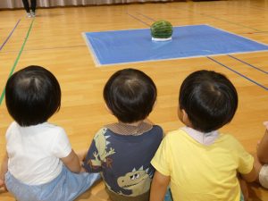 みんなで大きなすいかを触りました。なでなで…ポンポン…。