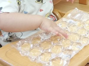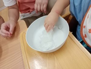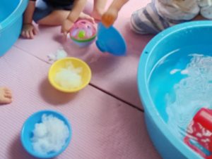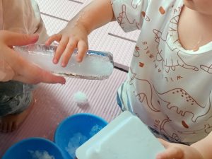 水遊びの中で氷にも触りました。冷たさにビックリ!