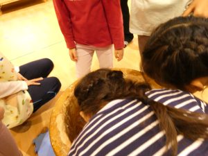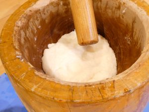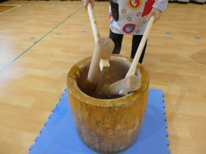 ホールに大きな臼と杵が登場。「この道具の名前、知ってるかな?」