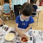6月19日(水) 年少組さんにさくらんぼジャム作りのお手伝いでさくらんぼの種をとるお手伝いをしてもらいました。